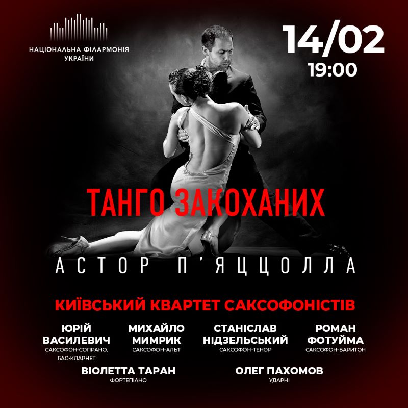 14 лютого, у день Святого Валентина знаний Kyivsaxquartet гратиме безсмертні хіти Астора П’яццолли у програмі «Танго закоханих».