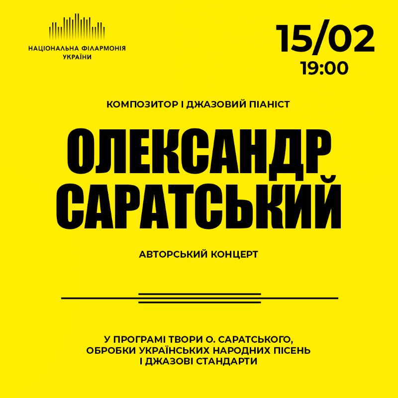 15 лютого композитор і джазовий піаніст Олександр Саратський виступить із своїм авторським концертом, в програмі якого власні твори, обробки українських народних пісень і джазові стандарти.