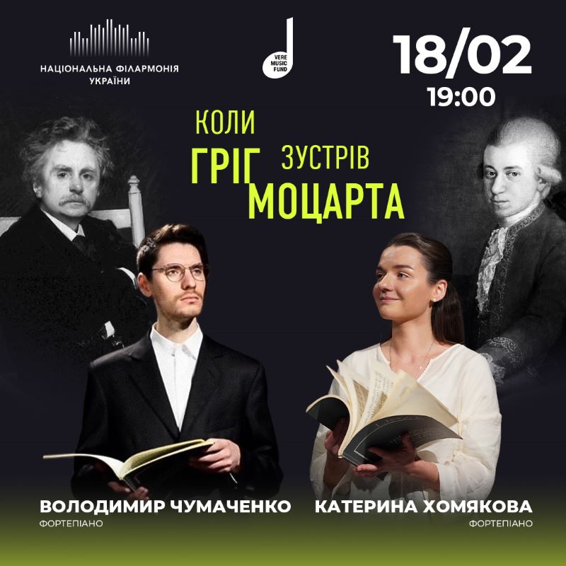 18 лютого на сцені Колонного залу відбудеться музична зустріч віденського класика та норвезького романтика у програмі «Коли Моцарт зустрів Гріга». Задум належить творчому дуету піаністів – Катерині Хомяковій та Володимиру Чумаченку.