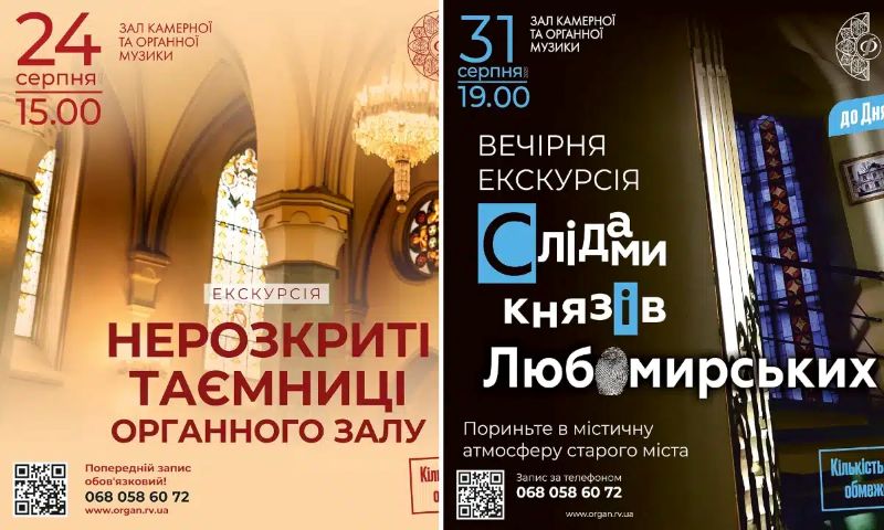 24 серпня о 15:00 "Нерозкриті таємниці Органного залу" Це подорож у глибини часу. Відвідувачі зможуть почути легенди про зниклі реліквії, символи, заховані у стінах, і доторкнутися до загадок, які береже будівля вже не одне століття. Атмосфера підземних ходів, тіні минулого й велич органної музики створять справжнє занурення в містичну історію міста.