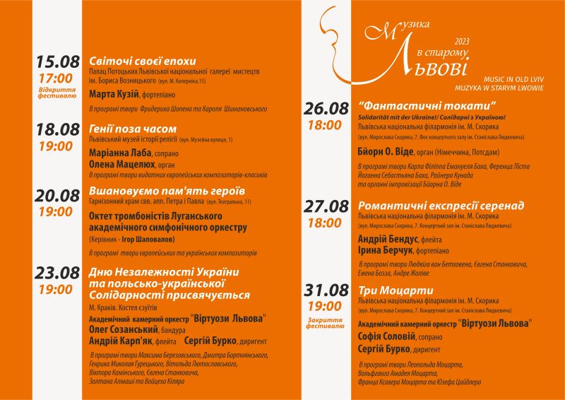 Концерти X. Міжнародного фестивального проєкту "Музика в старому Львові " в партнерстві з польськи фестивалем "Музика в старому Кракові” (15-31 серпня 2023 року):