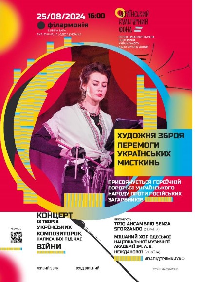 25 серпня о 16 годині в Одеській обласній філармонії відбувся концерт під назвою «Художня зброя перемоги українських мисткинь» із творів українських композиторок і поетес, котрі написані під час війни. Проєкт «Художня зброя перемоги українських мисткинь» присвячений героїчній боротьбі українського народу проти російських загарбників і реалізується за підтримки Українського культурного фонду.
