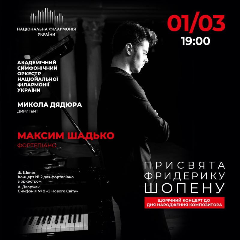 1 березня відзначають день народження істинного музичного романтика Фридерика Шопена. Традиційно концерт до чергової річниці всесвітньо-відомого польського класика проходить і у Філармонії. У наші дні, вшанування пам’яті великого польського композитора, представника народу, який підтримує Україну – є надзвичайно актуальним та виправданим. В концерті-присвяті звучатиме знаменитий Другий фортепіанний концерт з оркестром у виконанні піаніста Максима Шадька. Доповнить вечір симфонія «З Нового Світу» №9 Антоніна Дворжака під керівництвом Миколи Дядюри.