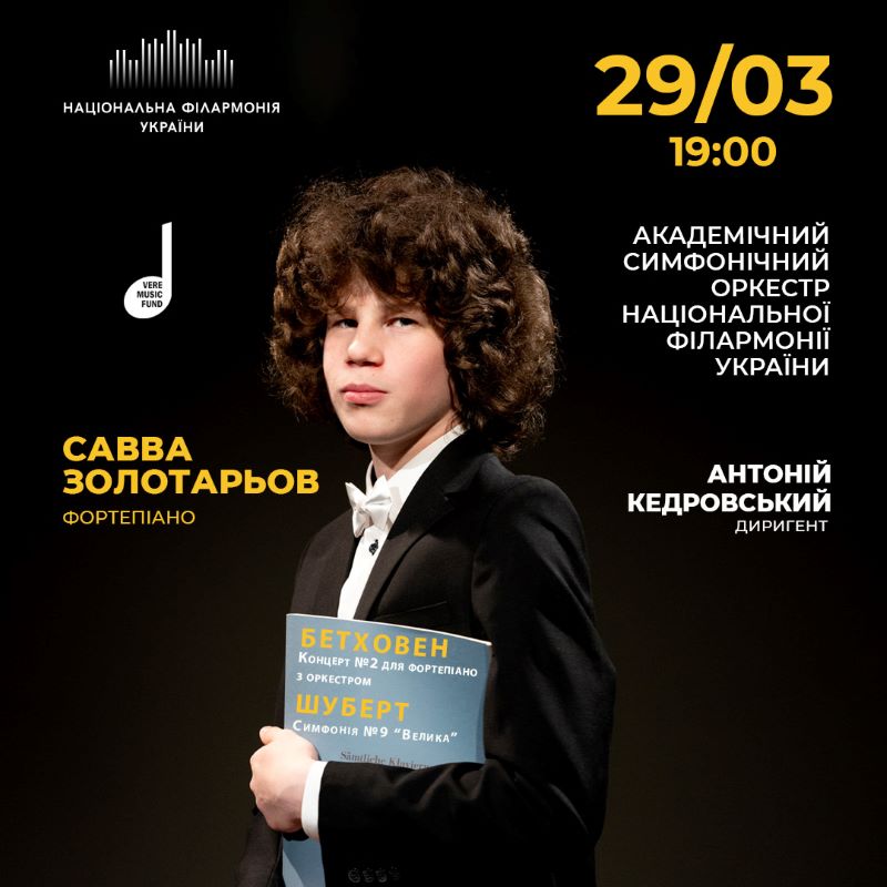 29 березня на сцені філармонії зовсім юний музикант – тринадцятирічний піаніст Савва Золотарьов, який вперше виступить разом із симфонічним оркестром НФУ під орудою диригента Антонія Кедровського. У їх виконанні прозвучить Другий фортепіанний концерт Людвига ван Бетховена. Звучатиме також остання «Велика» симфонія основоположника романтизму Франца Шуберта.