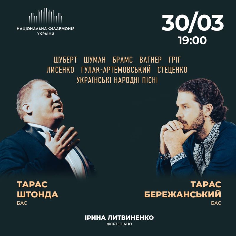 30 березня на сцені філармонії унікальний ансамбль двох басів – Тараса Штонди й Тараса Бережанського, який наслідує кращі традиції української вокальної басової школи.