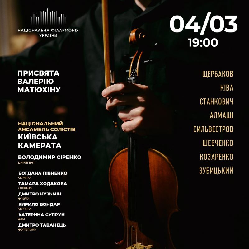 4 березня виступ Національного ансамблю солістів «Київська камерата» присвячений 75-річчю від дня народження засновника і незмінного керівника колективу Валерія Матюхіна.