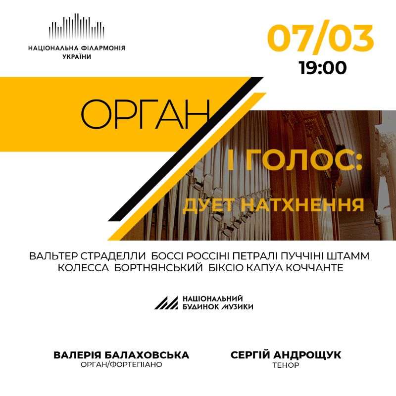 7 березня у програмі «Орган і голос: дует натхнення» прозвучать перлини західноєвропейської музичної спадщини ХVІІІ-ХХ століть та декілька творів українського авторства. Ця програма – родзинка репертуару Національного будинку музики, адже є унікальним дуетом тембрів – органістки Валерії Балаховської й тенора Сергія Андрощука.