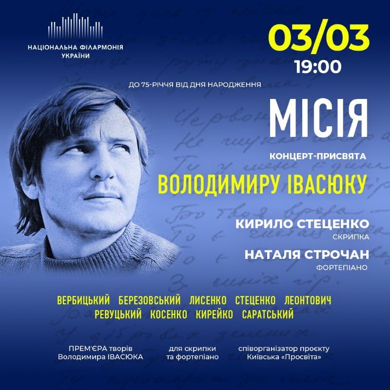 3 березня концерт «Місія», присвячений 75-річчю Володимира Івасюка. У програмі ретельно відібрані скрипкові твори, насичені інтонаціями та ритмами, притаманними українській етнічній традиції та неповторній музичній ідентичності українського духу композиторів XVIII-XXI ст. – Березовського, Вербицького, Лисенка, Стеценка, Леонтовича, Ревуцького, Косенка, Кирейка, Саратського. Ініціатор і автор концерту Кирило Стеценко вперше гратиме на сцені Національної філармонії твори Володимира Івасюка для скрипки і фортепіано. Ноти були подаровані виконавцю родиною композитора.