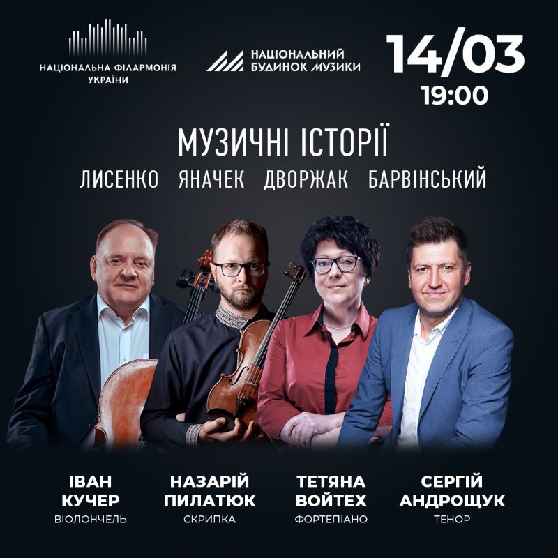 14 березня Національний будинок музики за участю ТОПових солістів: Івана Кучера, віолончель, Назарія Пилатюка, скрипка, Тетяни Войтех, фортепіано і тенора Сергія Андрощука, – представить програму «Музичні історії».