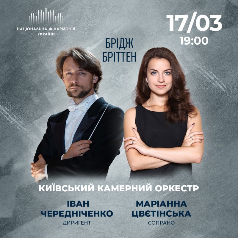 17 березня програма Київського камерного оркестру під орудою головного дириґента Львівської Опери Івана Чередніченка представить творчість двох британських композиторів – Франка Бріджа та Бенджаміна Бріттена, оркестрові опуси яких є складними у виконанні та належать до елітарної музики. За життя митці були добре знайомі і товаришували. Один з відомих ранніх опусів Бріттена – пісенний цикл «Les Illuminations» для сопрано та оркестру, написаний на тексти з однойменної збірки Артюра Рембо виконає сопрано Маріанна Цвєтінська.