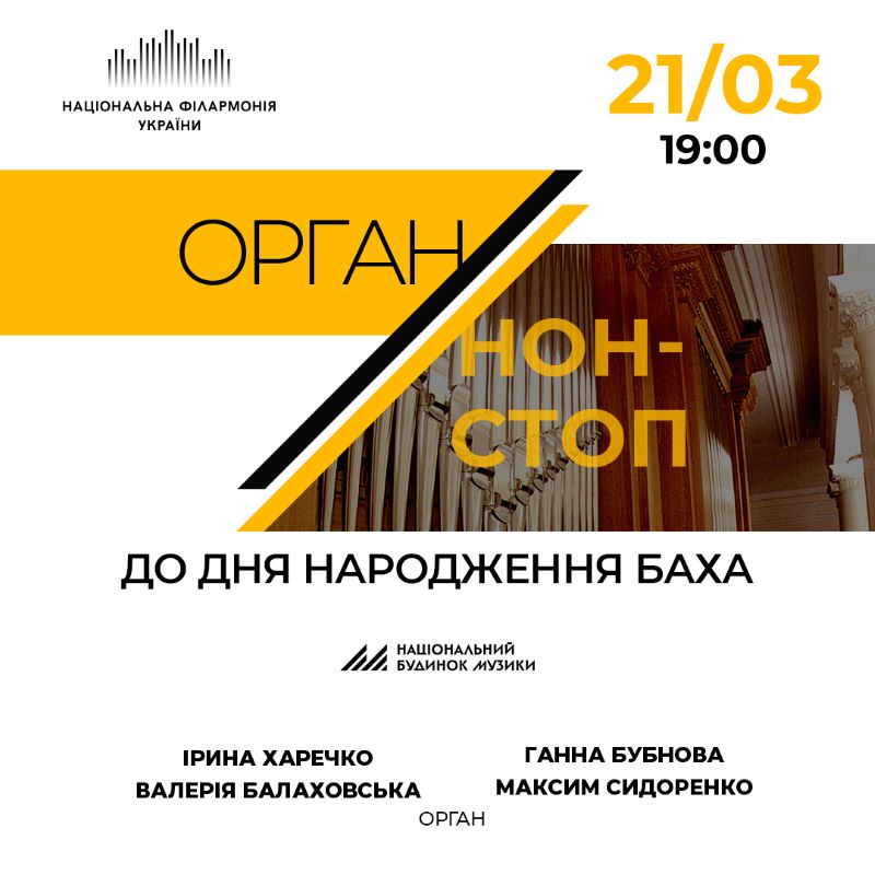 Вечір можна назвати справжнім святом органа, адже виступатимуть найкращі органісти України, солісти Національного будинку музики: Ірина Харечко, Валерія Балаховська, Ганна Бубнова і Максим Сидоренко.