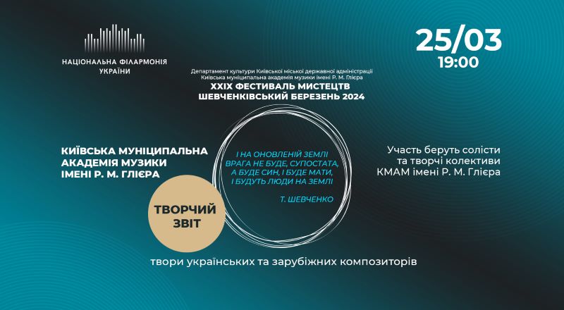 В цих концертах можна буде почути учнів, симфонічний оркестр і хорові колективи ліцею імені Миколи Лисенка. А вже 25 березня естафету перехопить Київська муніципальна академія музики імені Рейнґольда Глієра ХХІХ фестивалем мистецтв «Шевченківський Березень 2024».