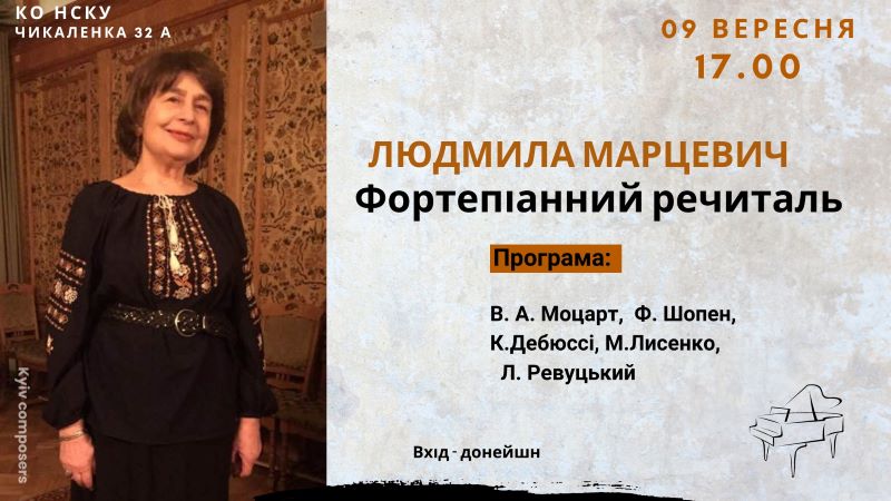 9 вересня команда Kyiv composers запрошує слухачів на Фортепіанний речиталь Людмили Марцевич, який відбудеться 09 вересня, о 17 годині, в залі Київської організації Національної спілки композиторів України (КО НСКУ), за адресою: Євгена Чикаленка 32 А (бувша пушкінська, яку гугл ніяк не змінить...).