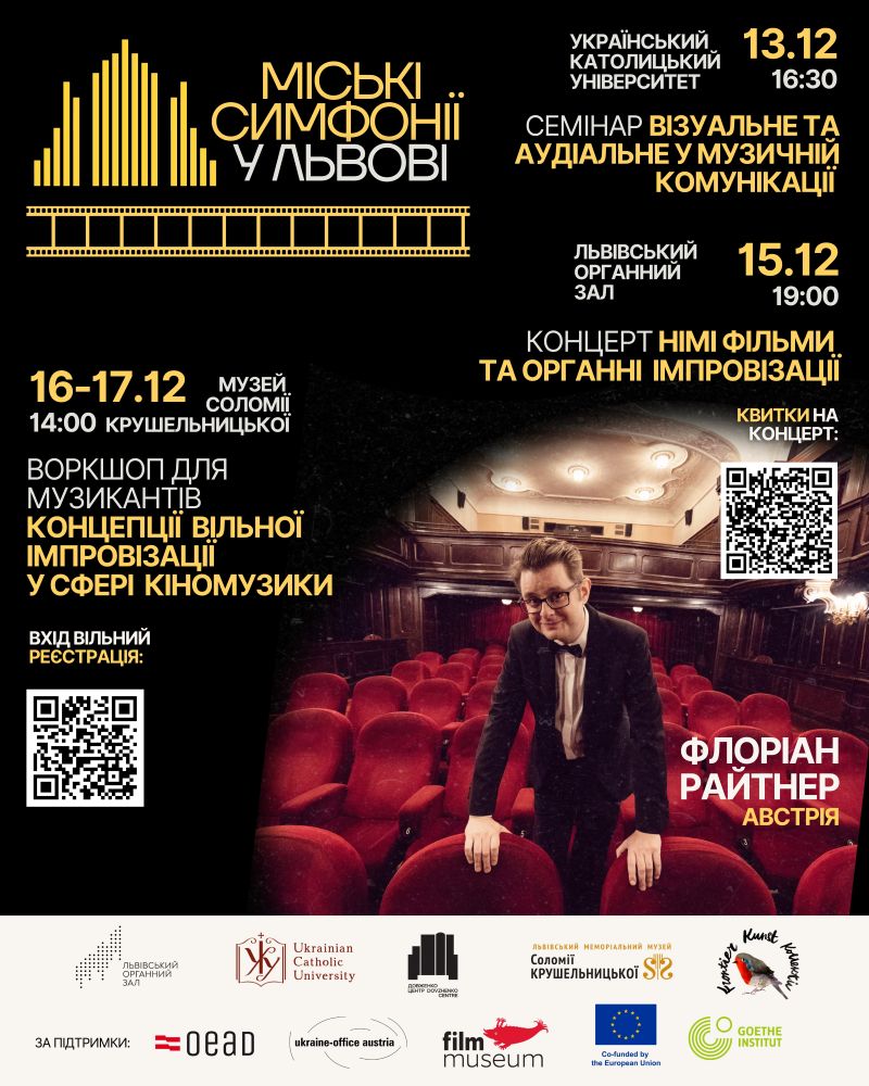 Львівський органний зал спільно з Музично-меморіальним музеєм Соломії Крушельницької у Львові готуються до ексклюзивних подій, які поєднають органну музику, кінематографство і мистецтво імпровізації! 15-17 грудня австрійський композитор і віртуоз Флоріан Райтнер представить одразу дві ексклюзивні програми: вечір органних імпровізацій до рідкісних кінохронік початку ХХ століття у Львівському органному залі та воркшоп "Концепції вільної імпровізації у сфері кіномузики" в Музично-меморіальному музеї Соломії Крушельницької. На вас чекають кінематографічні подорожі крізь час, унікальний підхід до музики й надихаючий досвід у товаристві справжнього майстра.