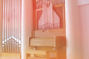 Орган розміщений в спеціально відгородженій кімнаті, вхід в яку веде з невеликої службової кімнати для органіста, яка використовується як артистична. Основна кількість труб розміщена на другому ярусі цієї кімнати фактично на рівні балкона, що покращує розповсюдження звукових хвиль. Пульт управління знаходиться на невисокій сцені, яка достатня для виступів невеликого камерного оркестру та солістів.