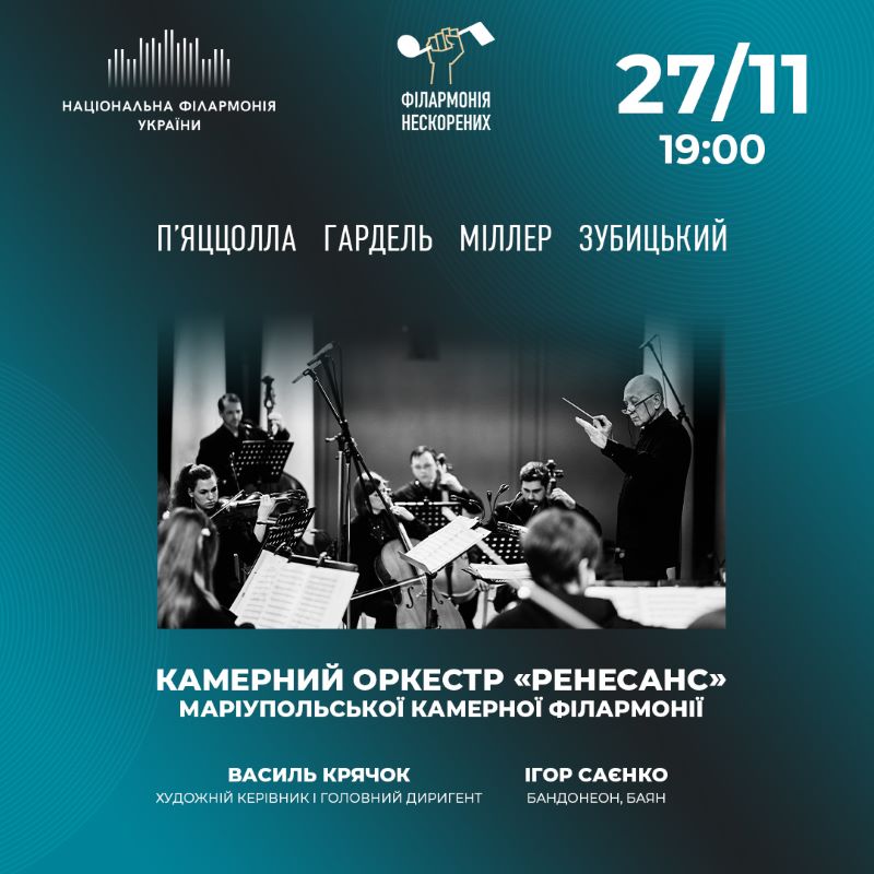 Також прозвучать: концерт Aconcagua П’яццолла для бандонеона і струнного оркестру та концерт для баяна з оркестром сучасного українського композитора Володимира Зубицького – «Присвята Астору П’яццоллі».