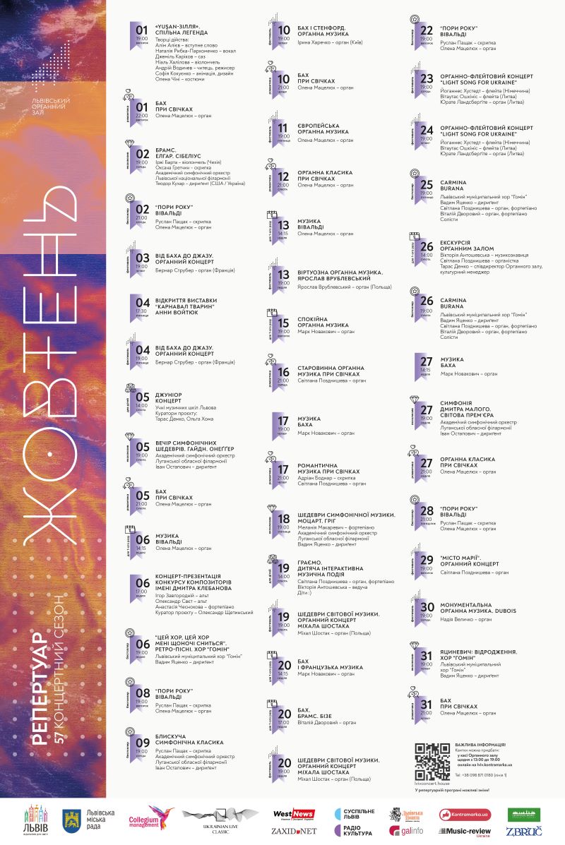 У жовні у Львівському органному залі заплановано 45 подій, серед них – відкриття XIV Львівського міжнародного органного фестивалю, світова премʼєра симфонії Дмитра Малого, великі симфонічні концерти за участі Луганського філармонійного оркестру, масштабна Carmina Burana у виконанні хору та органа та перше виконання творів Якова Яциневича. А ще – концерти при свічках, улюблені органні та хорові концерти, програма для дітей, екскурсія та відкриття нової виставки в Галереї.