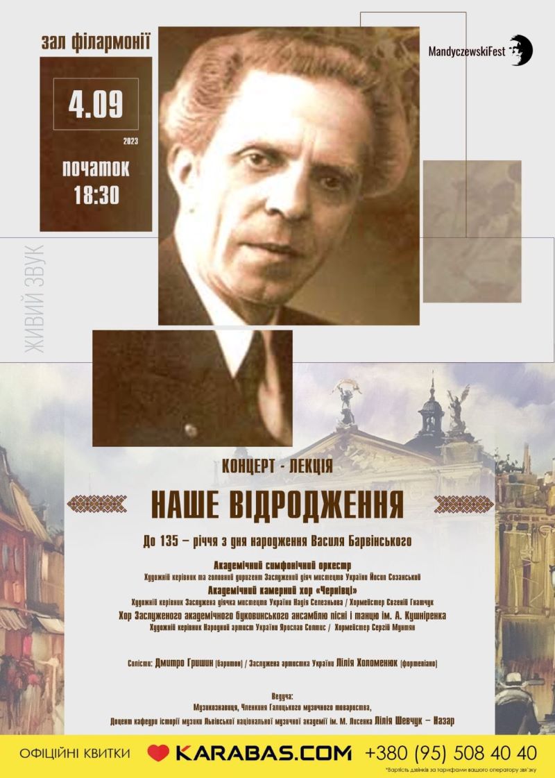 4 вересня у Чернівецькій філармонії ім. Д. Гнатюка відбудеться концерт-лекція, присвячена 135-річчю з дня народження Василя Барвінського