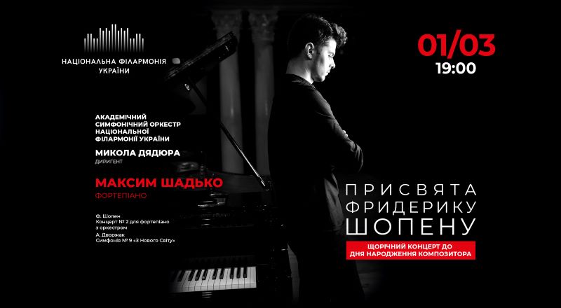 Відкриє концерт-присвяту знаменитий Другий фортепіанний концерт з оркестром у виконанні піаніста Максима Шадька. Цей твір, сповнений пристрасної меланхолії, адже писався під впливом нерозділених почуттів автора до Констанції Гладковської, обдарованої співачки, знаної варшавської красуні. Прем’єра концерту відбулася у березні 1830 року у Варшаві у виконанні автора. Диригував Кароль Крупінський.