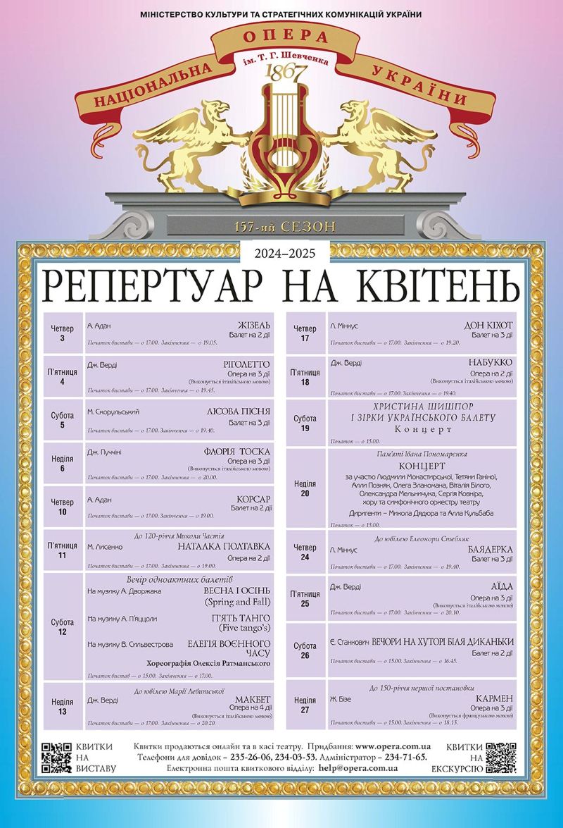 Окрім світових та українських шедеврів оперного і балетного мистецтва, що є окрасою поточного репертуару, до квітневої афіші увійдуть також гала-концерти та присвяти до знакових подій.