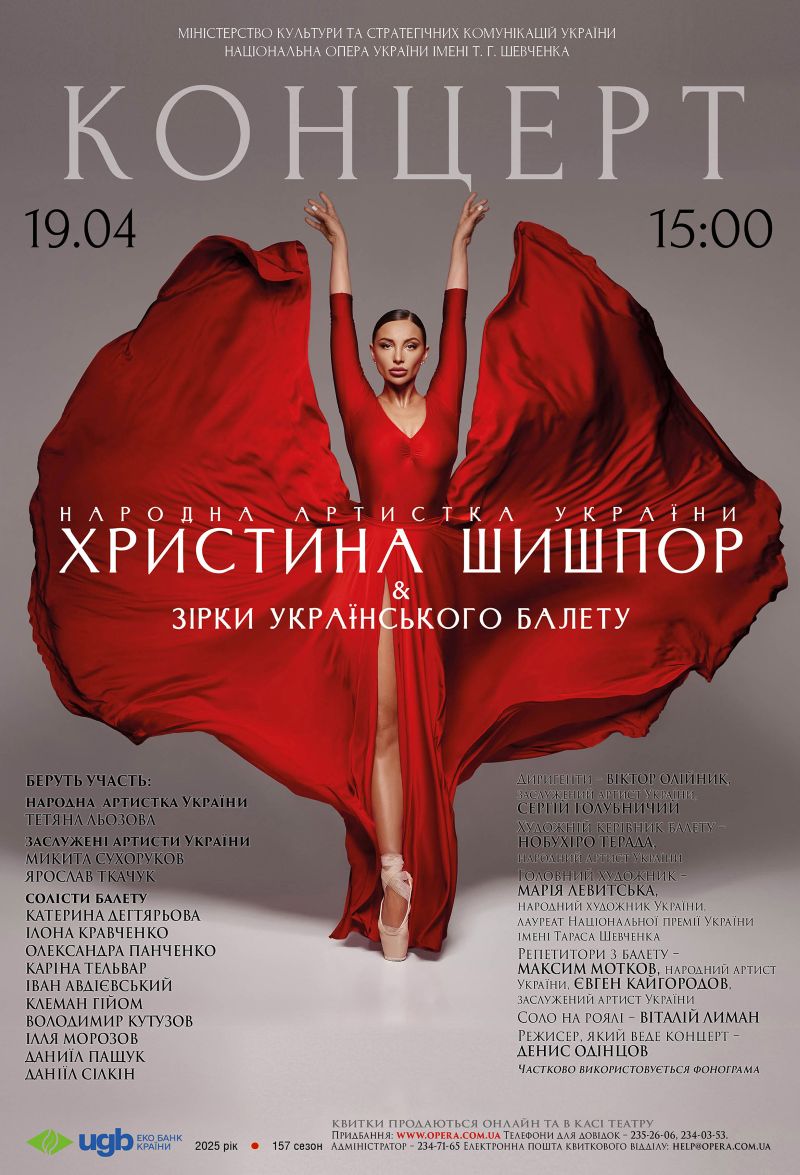 19 квітня (субота) о 15:00 – грандіозне балетне дійство «Христина Шишпор та зірки українського балету». Концерт за участі провідних солістів балетної трупи Національної опери України.