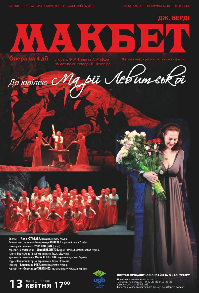 13 квітня (неділя) о 17:00 – опера «Макбет» Дж.Верді. До ювілею Марії Левитської.