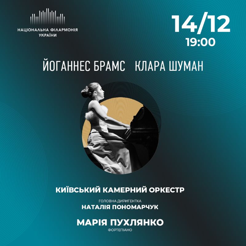 Концерт для фортепіано з оркестром ля мінор Клари Шуман-Вік виконає Марія Пухлянко, фортепіано. Прем'єра в Україні!