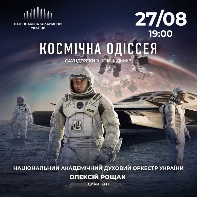 Так само і наші мелодії відлітають у подорож з найкращими режисерами та композиторами Голлівуду у все ще незвіданий космічний Всесвіт. Національний духовий оркестр України під керівництвом диригента Олексія Рощака запрошує взяти участь у захоплюючій Космічній музичній Одіссеї. Натхненні безмежними космічними просторами, у виконанні духового оркестру, – звучатимуть: Hans Zimmer, James Horner, David Arnold, Brian Tyler Ludwig Gora, John Williams, Richard Strauss, nsson, Michael Giacchino, Alexander Courage & Gene Roddenberry, Jerry Goldsmith. Музика з найвідоміших голлівудських космічних блокбастерів: «Інтерстелар», «Зоряні війни», «Аватар», «Аполон-13», «Армагедон», «Мандалорець», «Інопланетянин», «Зоряний шлях», «День Незалежності», – супроводжуватиме рух космічних кораблів та небесних тіл на великому екрані просто перед очима публіки.