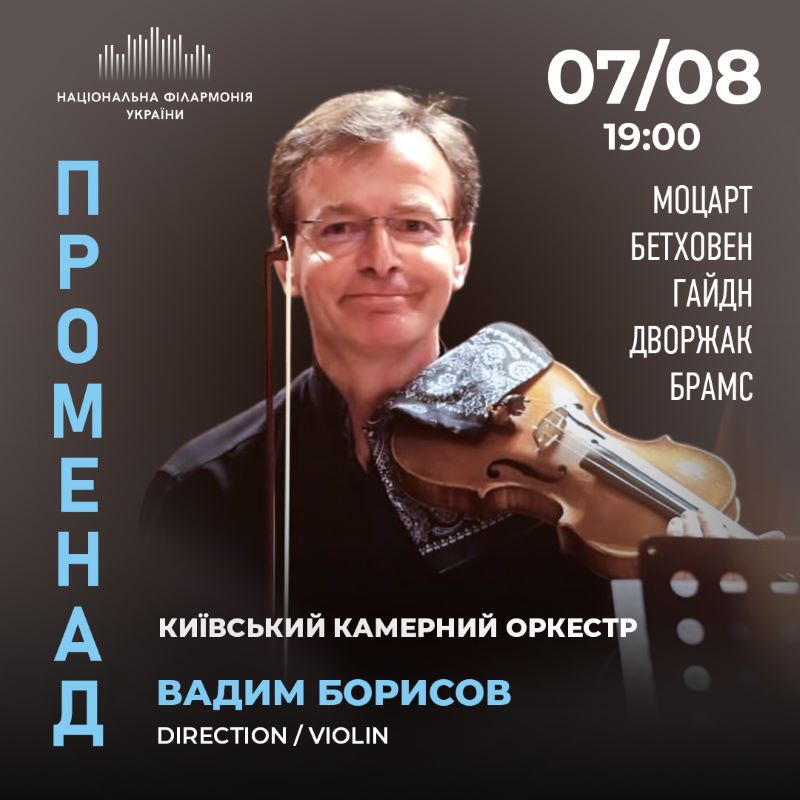 Променад Київського камерного оркестру за ідеєю Вадима Борисова, direction/violin 7 серпня – це прогулянка класичним репертуаром для струнного оркестру. Тут є місце для улюблених оперних мелодій із «Чарівної флейти» Моцарта, класичної врівноваженості квартетів Гайдна, ніжним мелодіям Бетховена та запальності танців Дворжака і Брамса. Давно знані мелодії у такому поєднанні розкриють нові грані сприйняття – лірика у відтіненні моторики, відоме поруч із малознаним.
