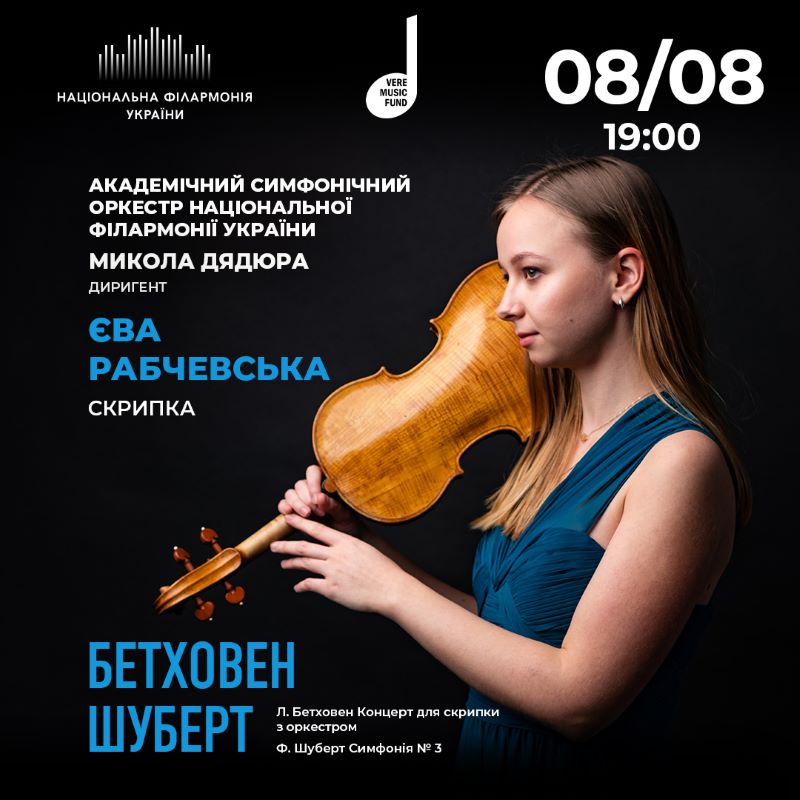 8 серпня Симфонічний оркестр Національної філармонії України під орудою маестро Миколи Дядюри гратимуть Концерт для скрипки з оркестром Бетховена та третю симфонію Шуберта. Солюватиме скрипалька Єва Рабчевська, яка до 2021 року була студенткою Queen Sofia College of Music в Мадриді. З 2022 року навчається в берлінському Hochschule für Musik Hanns Eisler. Зараз скрипалька є учасницею Karajan-Akademie, а з серпня 2023 року Єва – музикантка основного складу легендарного оркестру Berliner Philharmoniker. До речі, cкрипковий концерт Бетховена був написаний спеціально для молодого скрипаля-віртуоза Франца Клемента. Але тільки з середини ХІХ століття він потрапляє у поле зору скрипалів, які справедливо оцінюють його художні якості. Звідтоді цей твір – класика віртуозних творів для скрипки. Не пропустіть його виконання.