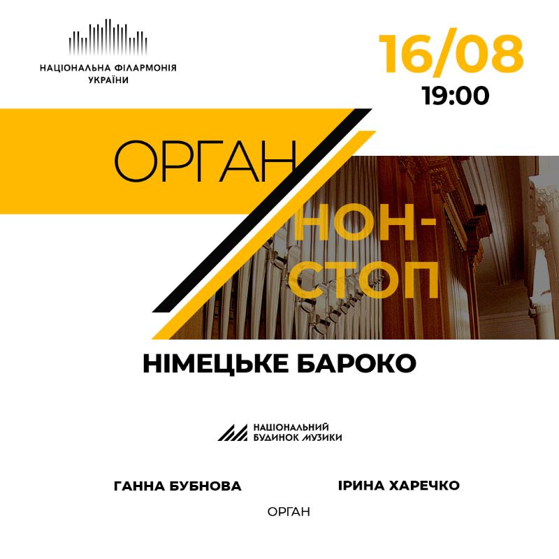 16 серпня на публіку очікує Орган нон-стоп: німецьке бароко у виконанні солісток Національного будинку музики Ганни Бубнової та Ірини Харечко. Звучання органа здатне красномовно розповісти про становлення німецької музичної традиції. Почуйте музику органних майстрів німецького бароко Дітріха Букстегуде, Георга Бьома та Ніколауса Брунса, якими надихався Йоганн Себастьян Бах та продовжуємо насолоджуватися ми. Звісно, не залишимо вас без знакових творів і самого Баха, зокрема, його знаменитої Токати і фуги ре мінор.