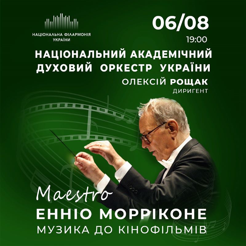 Серпневого вечора, 6.08, – знову звучатиме музика одного із найвідоміших кінокомпозиторів нашої епохи – італійця Енніо Морріконе. Публіка зможе не лише насолодитися музикою у виконанні Національного духового оркестру України під орудою диригента Олексія Рощака, але й побачити на великому екрані Колонного залу фрагменти улюблених кінострічок.