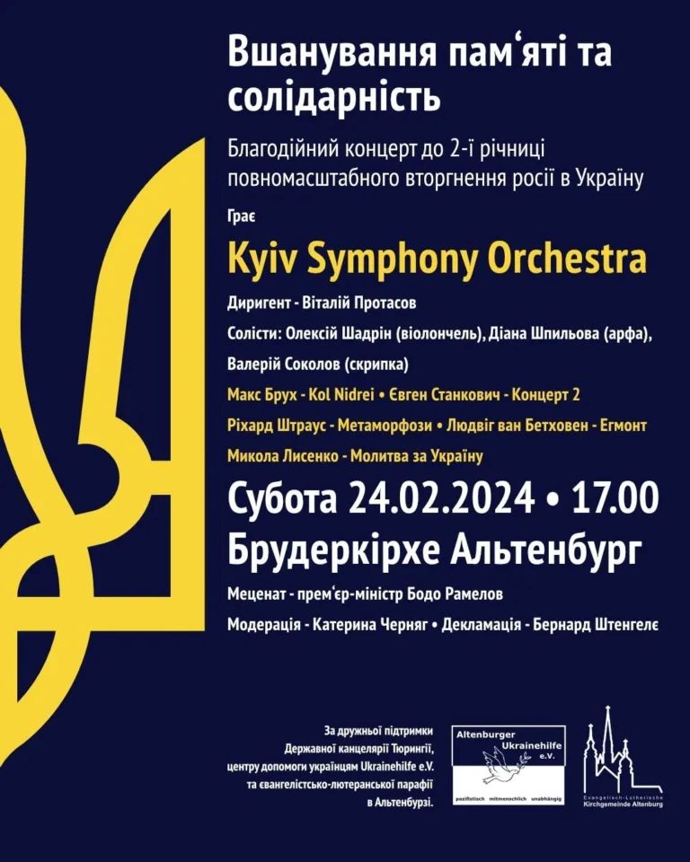 З метою привернення уваги до жахіття, яке чинить у 21-ому столітті росія, Kyiv Symphony Orchestra дає два концерти в Німеччині 23 (Гера) та 24 (Альтенбург) лютого.