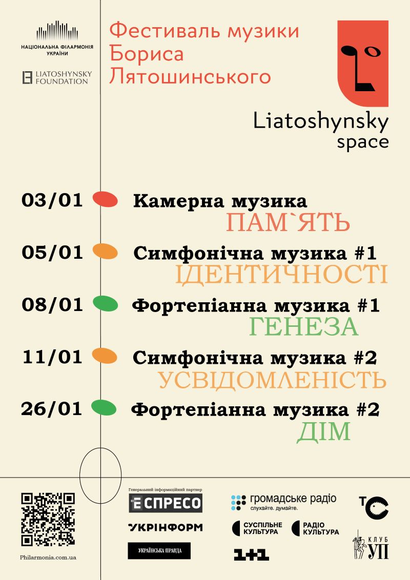 Початок нового 2025 року у філармонії позначиться видатною і знаковою для всієї української культури подією: Фестивалем музики Бориса Лятошинського, який триватиме з 3 по 26 січня. День першого концерту і відкриття обрано не випадково: саме 3 січня 1895 року народився Борис Лятошинський. 2025 року культовому українському композитору – 130! На честь класика ХХ століття, засновника нової української музики вперше організовано Liatoshynsky Space 2025, в орбіту якого, Національна філармонія та Фундація Лятошинського радо запрошують не тільки всю Україну, але й увесь музичний світ на цілий ювілейний рік.