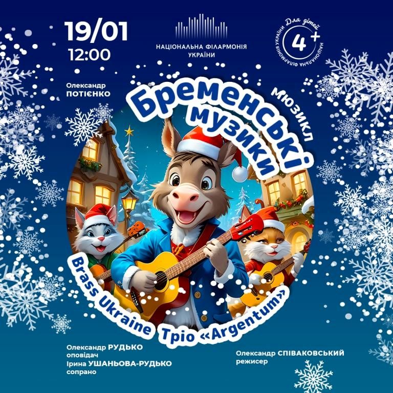 19 січня хіт дитячої аудиторії – мюзикл «Бременські музики». Музична казка 6+ за улюбленим сюжетом братів Грімм у січні, – з відлунням різдвяно-новорічних свят. Крутий Brass Ukraine: дві труби, валторна, тромбон, туба і ударні, Принцеса-сопрано і актори тріо Argentum здійснять у місті Бремен, ой!, у Колонній залі філармонії, – найзаповітніші мрії кожного, хто прийде! Допомагатиме їм Оповідач, який є файним знавцем казок і не проти долучитися до створення нової пригодницької історії про веселого Віслюка, підстаркуватого Пса, милого Котика та голосистих Півників. Мюзикл для усієї родини подарує яскраві враження, кольорові емоції й зарядить дітлахів та їх батьків на весь рік!
