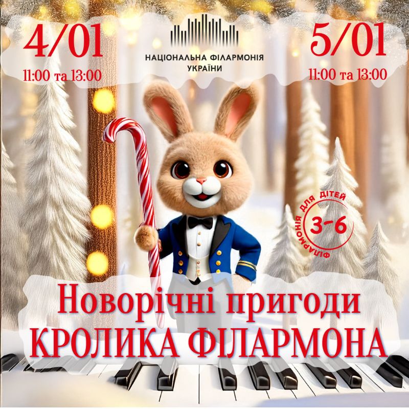 4 і 5 січня у Музичному салоні на двох сеансах щоденно:об 11:00 і 13:00 наймолодших меломанів від 3-х до 6-ти років очікують «Новорічні пригоди Кролика Філармона». Це новорічна історія про ельфійку та її друга і кролика Філармона, які потрапляють у казковий світ музики та шукають втрачену ноту, без якої неможливо зіграти головну новорічну мелодію.