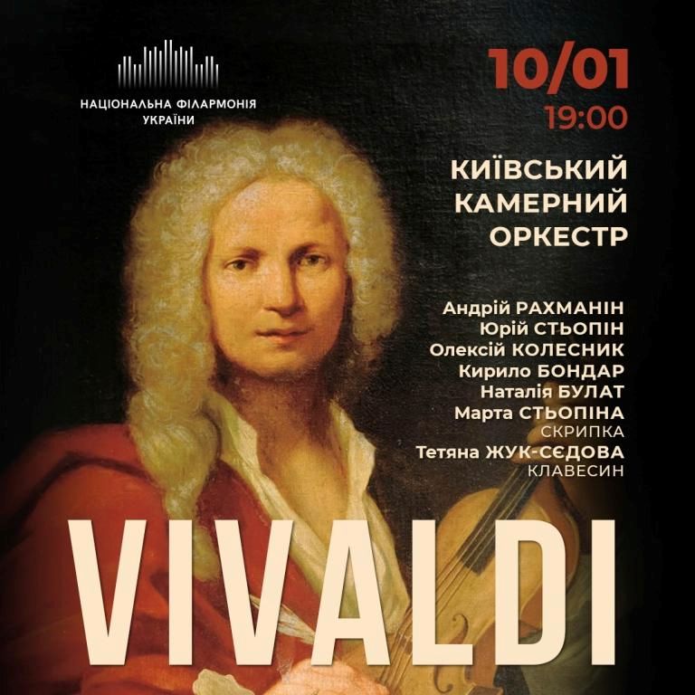 10 січня на сцені філармоніє звучатиме Вівальді. Один з найпомітніших майстрів барокової доби та один з найплідніших її представників, – Антоніо Лючіо Вівальді залишив після себе яскравий слід в історії музики не тільки як композитор усіх, існуючих на той час жанрів і форм, але й як віртуозний виконавець на скрипці. Тож, цього вечора, крім знаменитих концертів «Пори року», прозвучать його концрти: для двох скрипок струнних і basso continuo; для чотирьох скрипок, віолончелі, струнних і basso continuo; Концерт «Alla rustica»; дві симфонії для струнних і basso continuo. Можливо, менш відомі за знамениті «Пори року», але при тому не менш прекрасні.