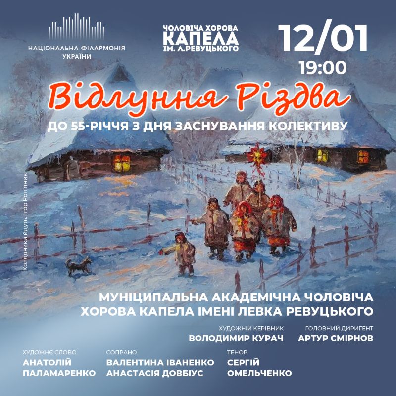 12 січня – муніципальна академічна чоловіча хорова капела імені Левка Ревуцького відзначатиме на сцені філармонії 55-річчя з дня заснування колективу концертом «Відлуння Різдва». Цього вечора звучатимуть маленькі хорові шедеври – колядки і щедрівки. У концерті бере участь майстер слова Анатолій Паламаренко.