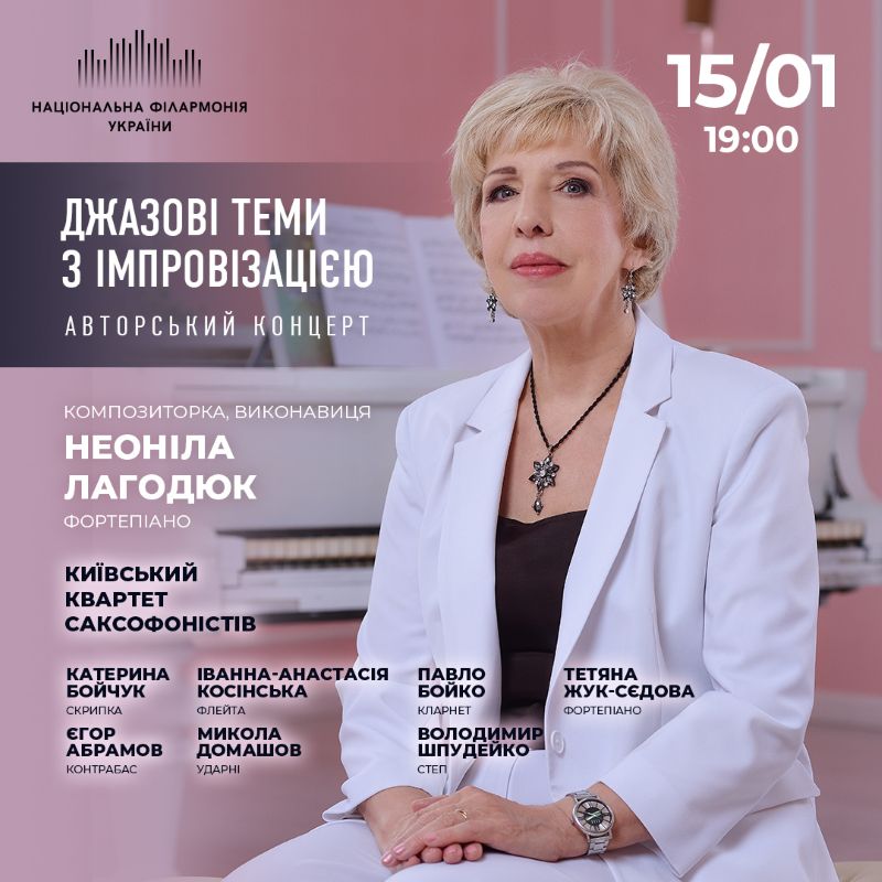 15 січня на свій традиційний щорічний авторський концерт «Джазові теми з імпровізацією» запрошує композиторка, відома джазова піаністка, викладачка і популяризаторка джазу – Неоніла Лагодюк. Разом з іншими музикантами: Київським квартетом саксофоністів, скрипалькою Катериною Бойчук, флейтисткою Іванною-Анастасією Косінською, кларнетистом Павлом Бойко, піаністкою Тетяною Жук-Сєдовою, контрабасистом Єгором Абрамовим, ударником Миколою Домашовим і степістом Володимиром Шпудейком, – композиторка представить твори, у яких втілюються риси класичного джазу ХХ століття. Запальні ритми, знайомі яскраві мелодії, енергія танцю, що відрізняють музику Неоніли Лагодюк – подарують слухачам незабутні враження.