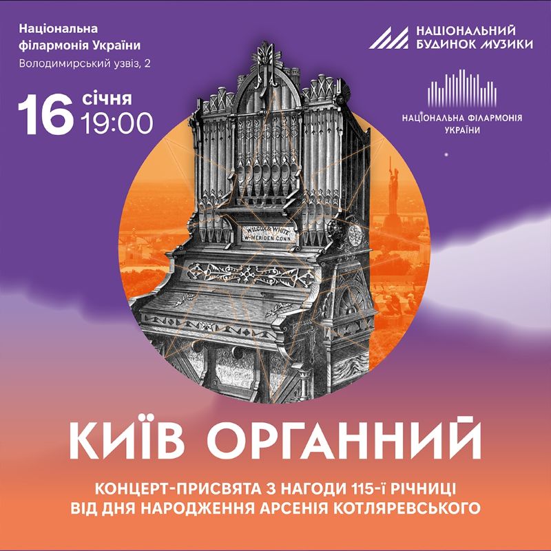 16 січня – концерт «Київ органний» до 115-річчя засновника київської органної школи Арсенія Котляревського. Органістки та органіст Національного будинку музики виконають улюблені твори майстра, а також опуси, що були присвячені йому. Саме завдяки Арсенію Котляревському у Києві було створено Будинок органної та камерної музики, першим керівником якого він був. Тож, цей вечір – вдячна музична присвята, яка стверджує, що традиції видатного органіста продовжують жити. Звучатимуть: Й.С. Бах, М. Колесса, Ф. Ліст, Р. Ваґнер–Ф. Ліст, Ш.М. Відор, Гі Бове, А. Ґільман ін.
