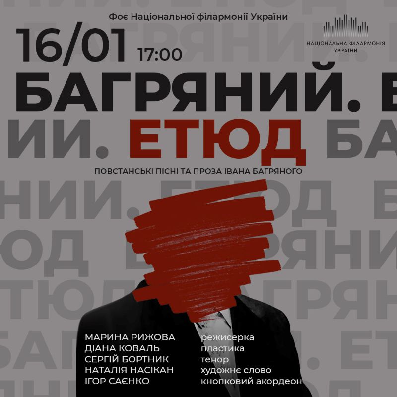16 січня «Багряний.Етюд». Сьогодні цитати з творів Івана Багряного друкують на футболках, а про кількість нових перевидань «Тигроловів» жартують, що їх мусить мати кожне поважне видавництво. Філармонія ж покаже те, що не так широко відомо в контексті творчості поета, прозаїка, драматурга, публіциста, журналіста, політичного діяча, Голови УНР та номінанта на Нобелівську премію з літератури: повстанські пісні на його вірші, але й не тільки. Проєкт-присвята Багряний. Етюд – заклик до теми військовополонених та політв’язнів, які наразі знаходяться на ворожих територіях. Синтетичний же формат «Багряного. Етюду» потребує особливого простору. Поміж колон та закапелків, де ви зазвичай публіка очікує на початок концертів, – постане дійство від режисерки та авторки ідеї Марини Рижової, у якому сплететься пластика Діани Коваль, художнє слово від Наталії Насікан, акордеон Ігоря Саєнка та повстанські пісні у виконанні Сергія Бортника.