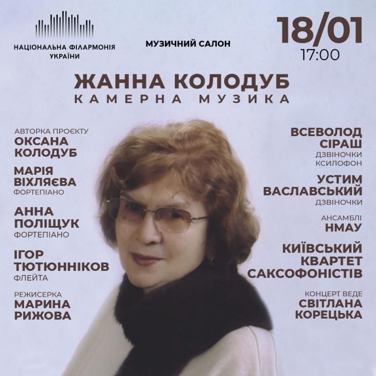 18 січня публіці буде представлений концерт «Жанна Колодуб. Камерна музика» – проєкт-присвята до 95-річчя композиторки. Ним донька композиторки, музикознавиця Оксана Колодуб започатковує цикл різножанрових концертів до ювілейного року Жанни та Левка Колодубів. Твори Жанни Колодуб приваблюють яскравими художніми образами, а особливо – щирістю, емоційністю і природністю висловлювання. Її творчість – яскраве індивідуальне явище, в якому класичні традиції і глибокі фольклорні основи вдало поєднуються із сучасними засобами музичного мислення. Музична спадщина Жанни Колодуб багатогранна і багатожанрова, зокрема цінними є камерно-інструментальні ансамблі, які являють собою вишукані колоритні композиції, написані для нетрадиційного складу інструментів, у чому можна буде пересвідчитись, завітавши на концерт і послухати камерні твори написані для флейти і фортепіано, ксилофону і дзвіночків, для флейти, фагота і фортепіано і для квартету саксофоністів!