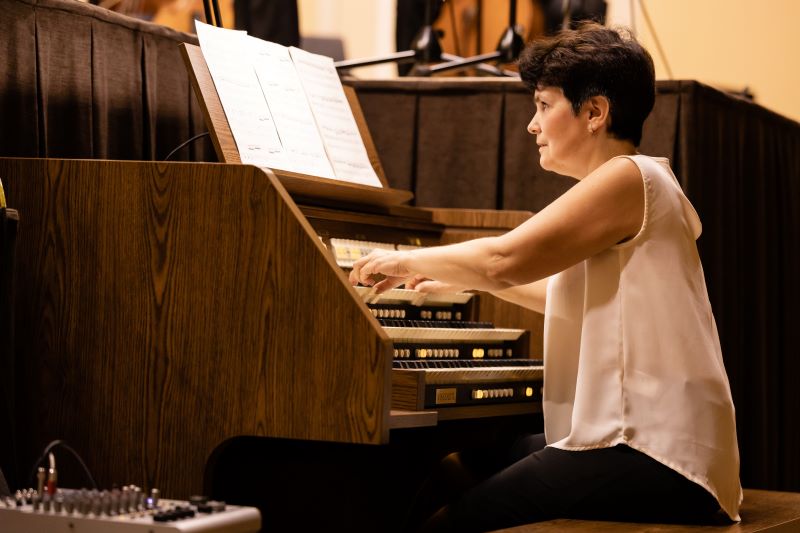 Розпочала програму духова музика композитора, а саме молитва “Te Deum”, соло в якій виконав керівник та концертмейстер оркестру Володимир Дуда.