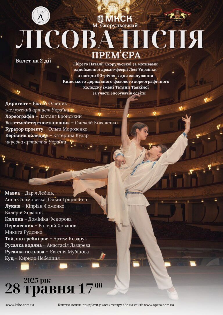 "28 травня о 17:00 на сцені Національної опери України відбудеться прем'єра легендарного балету "Лісова пісня" від студентів та учнів Київського державного фахового хореографічного коледжу імені Тетяни Таякіної", - йдеться у повідомленні.