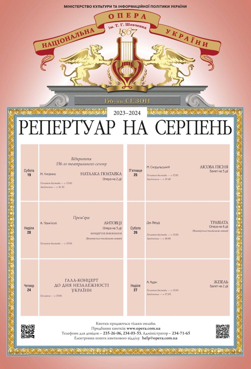 Також у фінальний місяць літа на шанувальників класичного балетного та оперного мистецтва окрім традиційних вистав з поточного репертуару театру чекає ще Гала-концерт з нагоди Дня Незалежності України та прем'єрний показ опери "Литовці" Амількаре Понк'єллі у концертному виконанні.