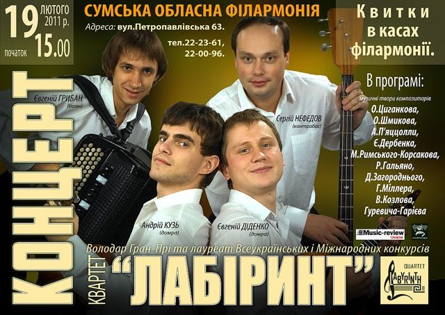 Лауреат Всеукраїнських та Міжнародних конкурсів квартет "Лабіринт"
