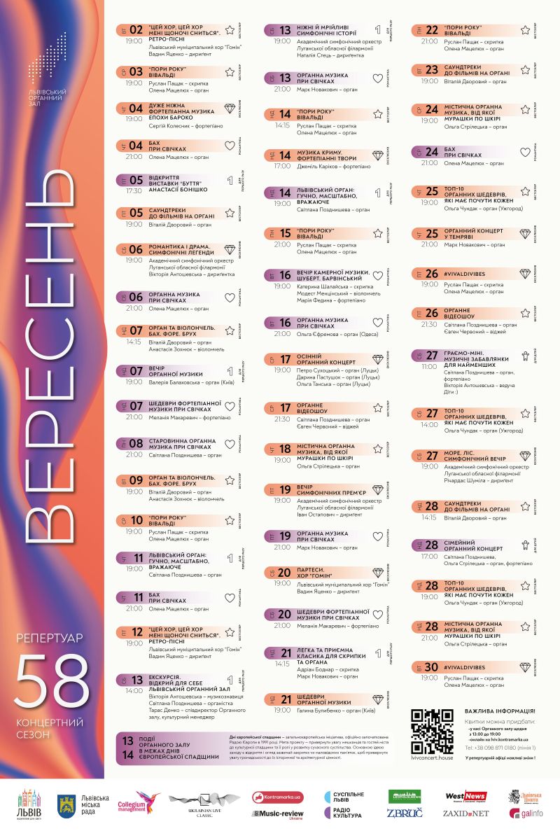 Новий, 58-й концертний сезон у Львівському органному залі розпочинається з наповненого та яскравого вересня. На відвідувачів чекає 50 подій: масштабні симфонічні концерти, нові органні програми, що вражають, витончені камерні вечори та нові формати від Органного залу.