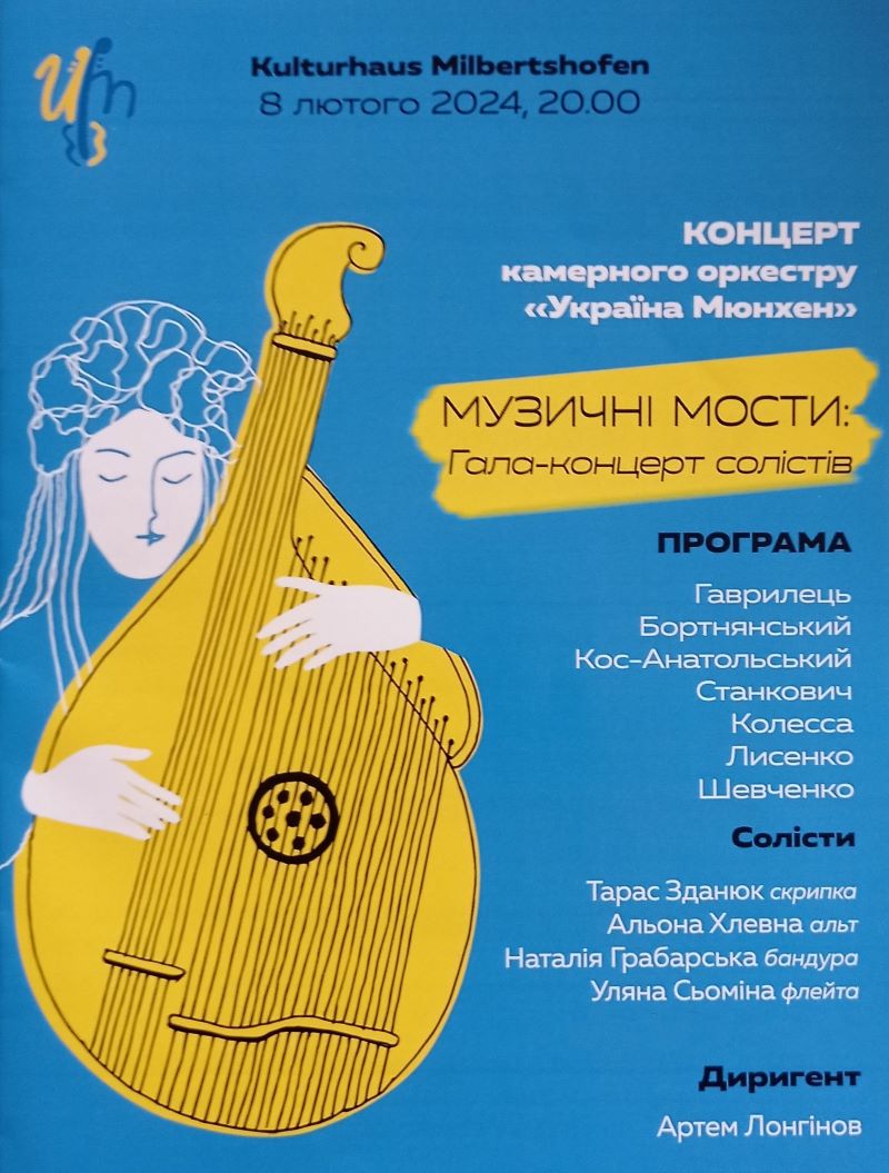 На одній сцені разом виступали українські музиканти з Мюнхенським камерним оркестром «Україна Мюнхен». Вечір відбувся під красномовною назвою «Музичні мости». Тематично це була виключно українська музика, з якою Баварська столиця та Німеччина, в цілому, починає цікавитись завдяки зусиллям ентузіастів. А прізвища композиторів - класиків та сучасних авторів теж перехрещувались біографічними стежками та поєднувались історичними мостиками.