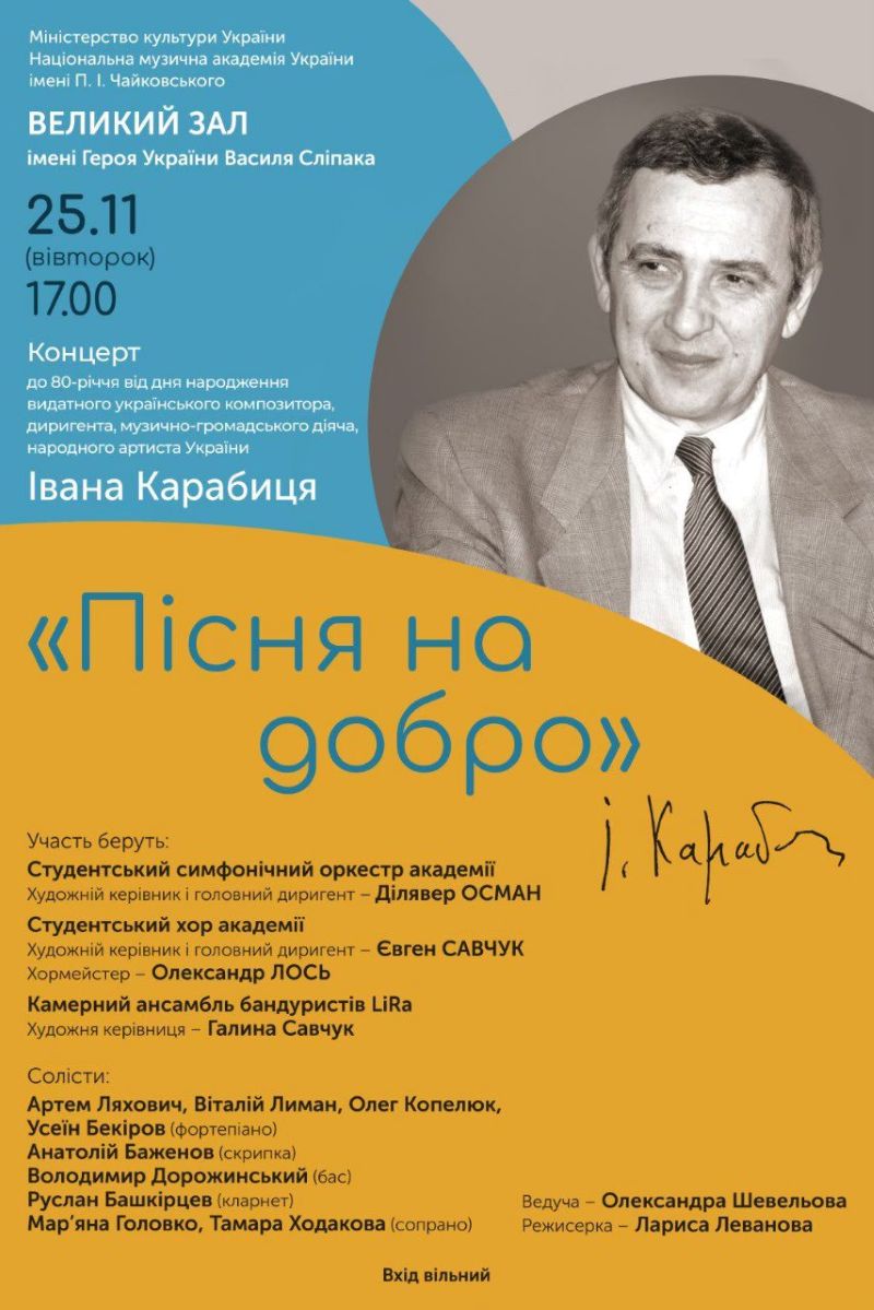 Концерт «Пісня на добро» присвячений 80-річчю від дня народження видатного українського композитора, диригента, музично-громадського діяча, народного артиста України Івана Карабиця.