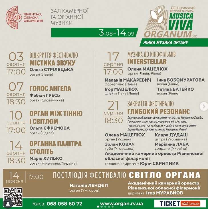 З 3 серпня по 14 вересня 2025 року у Рівному відбудеться VIII Міжнародний фестиваль органної музики «Musica Viva Organum» – Жива музика органа